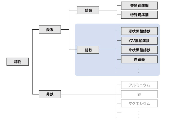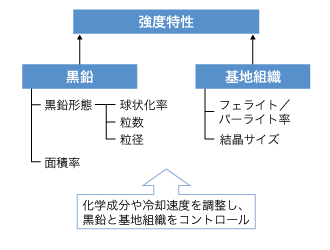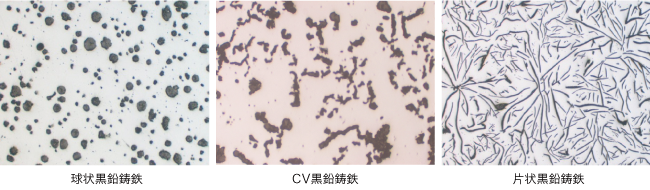 鋳鉄とは、鉄基地中に微細な黒鉛、あるいは炭化物が分散した複合材料であり、黒鉛や炭化物の形状および鉄基地の組織と合金組成を制御することにより、多様な材料特性を発揮することができます。鋳鉄の特性は、鉄基地中の黒鉛の形状、大きさ、分布などが関係しています。