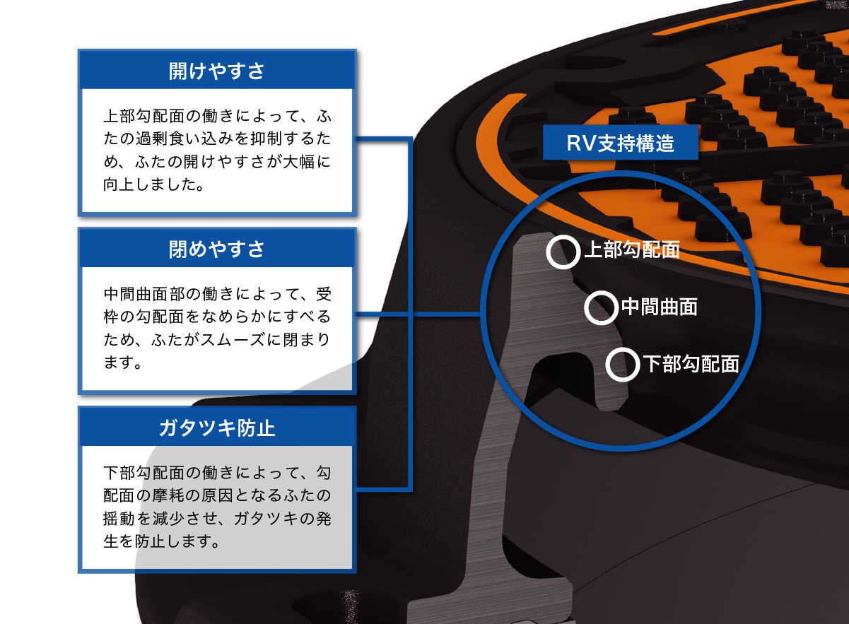 ふたと枠との嵌合に「RV支持構造」を採用することにより、ふたの食い込み力とふたの揺動(上下の動き)を制御。