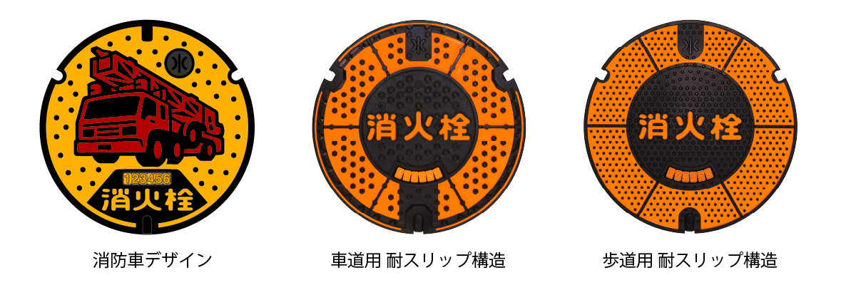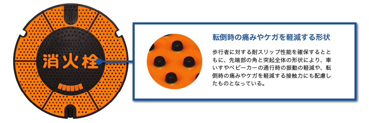 あらゆる人々が利用する歩道に設置される消火栓鉄蓋として、スリップやつまずきを防止するだけでなく、ユニバーサルデザインの視点から、車椅子の通行路のタイヤの取られ防止や、万が一の転倒時のケガの軽減などに配慮した専用の表層構造です。