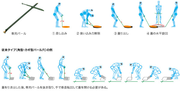 ROタイプは、専用バールを差し込んだ状態のまま、一連の動作で蓋をすばやく開けられます。