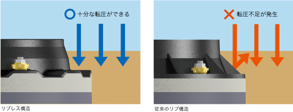 受枠外側のリブを無くすことによって、施工時の転圧作業がしやすくなりました。 これにより鉄蓋周辺の転圧不足による舗装の沈下や破損を防止します。