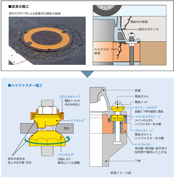 ハイジャスター施工は、AJフレームホルダで鉄蓋と下桝を緊結し、無収縮モルタル「ハイジャスター」を充填することで、高強度で隙間のない基礎調整部を成形す る施工方法です。鉄蓋と下桝がしっかりと固定されているため車両通行による受枠ごとのガタツキや、それによる道路舗装の破損を防止します。