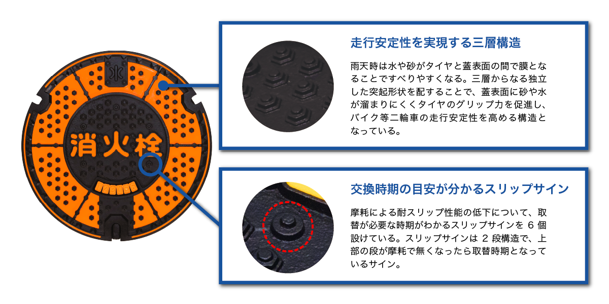 表層はタイヤのグリップメカニズムの解析によって導かれた理論に基づいた耐スリップ構造(鋳物一体成型の凹凸構造)で、濡れたアスファルトと同等のすべり抵抗値を長期間持続します。
